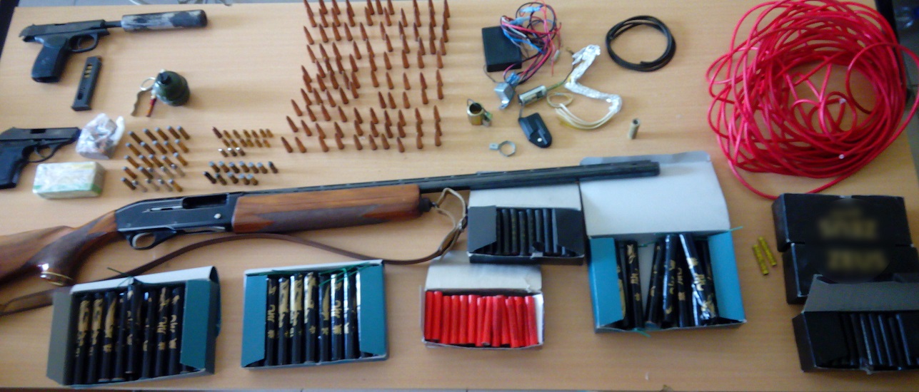 Ειδικότερα οι αστυνομικοί της Υποδιεύθυνσης Ασφαλείας Πύργου, βρήκαν και κατάσχεσαν ένα πιστόλι, με πέντε φυσίγγια στο γεμιστήρα του και ενσωματωμένο κυλινδρικό σιγαστήρα στη κάνη του, ένα ακόμα πιστόλι, μία χειροβομβίδα χωρίς πυροκροτητή, ένα λειτουργικό πυροκροτητή χειροβομβίδας, 100 φυσίγγια τυφεκίου, 127 φυσίγγια, πυροβόλων οπλών, χίλιες ενενήντα τέσσερις κροτίδες, δεκαπέντε μέτρα βραδύκαυστο φυτίλι, εννέα αυτοσχέδιους ηλεκτρικούς πυροκροτητές με κύκλωμα καλωδίων για ασύρματο τηλεχειρισμό με τηλεκοντρόλ, μια ημιαυτόματη καραμπίνα.
