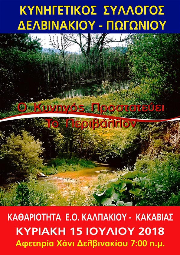 Το Δ.Σ. του Κυνηγετικού Συλλόγου Δελβινακίου – Πωγωνίου έπειτα από αίτημα της Γενικής Συνέλευσης για περισσότερες φιλοθηραματικές δράσεις αποφάσισε να πραγματοποιηθεί ΚΑΘΑΡΙΟΤΗΤΑ Ε.Ο. ΚΑΛΠΑΚΙΟΥ – ΚΑΚΑΒΙΑΣ την Κυριακή 15 Ιουλίου 2018 και ώρα 07:00 π.μ.!