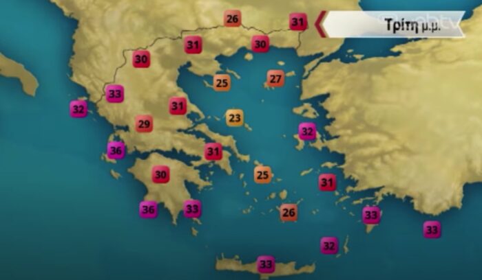 Θερμοκρασία: Από 18 έως 37 βαθμούς Κελσίου. Στα νησιά του Ιονίου η μέγιστη θα είναι 2 με 3 βαθμούς χαμηλότερη.