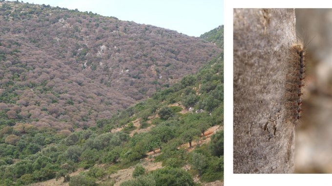 Πρόκειται για το λεπιδόπτερο Lymantria dispar, το οποίο κατατρώγει μεγάλο μέρος από τα φύλλα των δένδρων, ώστε από μακριά να δίδεται η εντύπωση ότι αυτά έχουν ξεραθεί.
