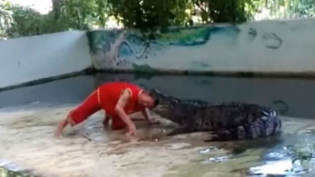 Στην αρχή όλα φαίνονταν να πηγαίνουν καλά, με τον κροκόδειλο να μένει ακίνητος όσο ο άνδρας έκανε τα κόλπα του. Όταν, όμως, προσπάθησε να βγάλει το κεφάλι του, ο κροκόδειλος τον άρπαξε με τα δόντια του και άρχισε να τον τινάζει δεξιά και αριστερά με μανία.