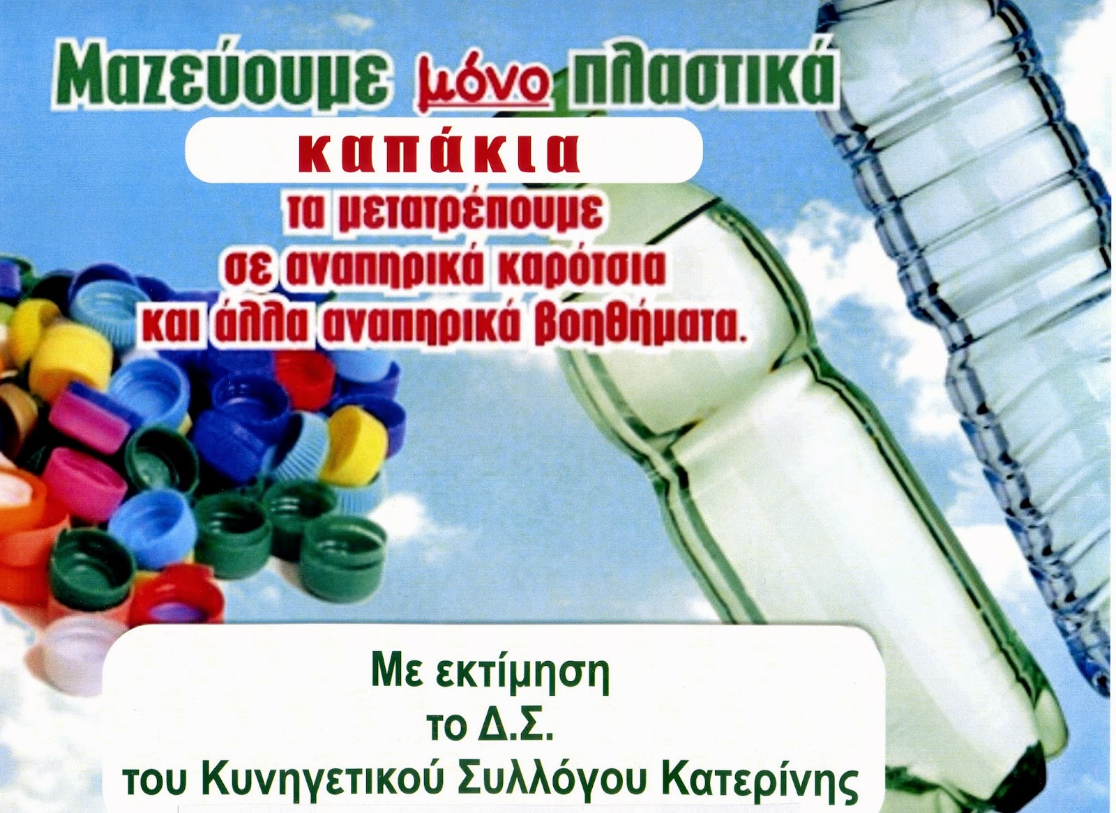 Για το λόγο αυτό κυκλοφόρησε και η σχετική ενημερωτική αφίσα που αναφέρει: «μην τα πετάς. Φέρτα σε εμάς! Βοηθάς. Μαζεύουμε μόνο πλαστικά καπάκια, τα μετατρέπουμε σε αναπηρικά καρότσια και άλλα αναπηρικά βοηθήματα».