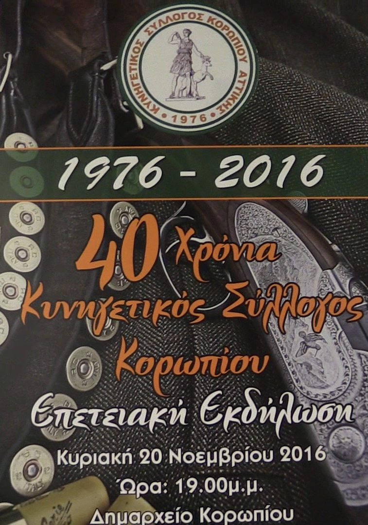 Την Κυριακή 20 Νοεμβρίου 2016 πραγματοποιήθηκε στο αμφιθέατρο του Δημαρχείου Κορωπίου μέσα σε κλίμα βαθιάς συγκίνησης, η μεγάλη επετειακή εκδήλωση συμπλήρωσης 40 χρόνων από την ίδρυση του μεγάλου συλλόγου της Αττικής, του Κυνηγετικού Συλλόγου Κορωπίου.