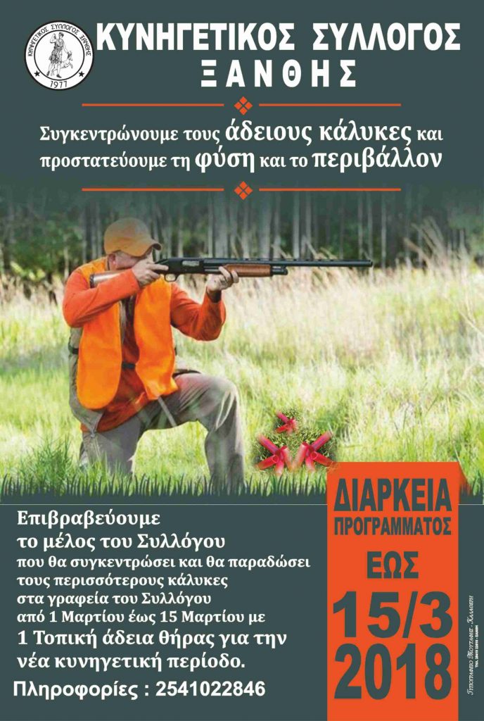 Ο ΚΣ Ξάνθης καλεί τα μέλη του να μαζέψουν τους άδειους χρησιμοποιημένους κάλυκες και να κερδίσουν μια τοπική άδεια θήρας για την επόμενη κυνγηετική χρονιά. Το πρόγραμμα με τίτλο “Συγκεντρώνουμε τους άδειους κάλυκες και προστατεύουμε τη φύση και το περιβάλλον” θα έχει ισχύ μέχρι τις 15 Μαρτίου του 2018.