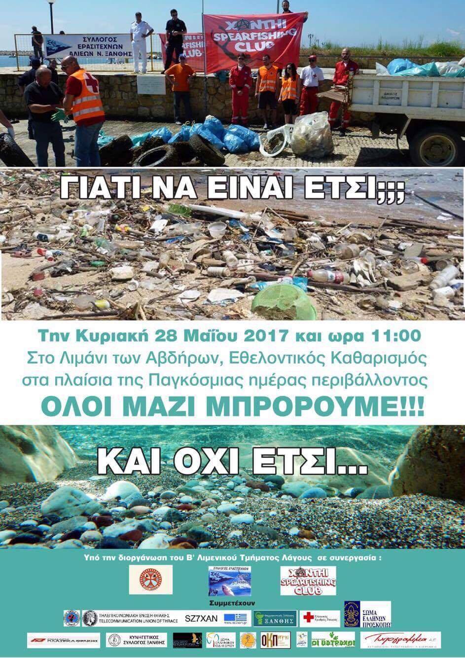 Στα πλαίσια της Παγκόσμιας Ημέρας Περιβάλλοντος ο Κυνηγετικός Σύλλογος Ξάνθης καλεί τα μέλη του να παρευρεθούν, στον εθελοντικό καθαρισμό που θα πραγματοποιηθεί στο λιμάνι των Αβδήρων και διοργανώνεται από το Λιμεναρχείο του Πόρτο Λάγος, με την συμμετοχή εθελοντικών ομάδων, την Κυριακή 28 Μαϊου στις 11:00 το πρωί.