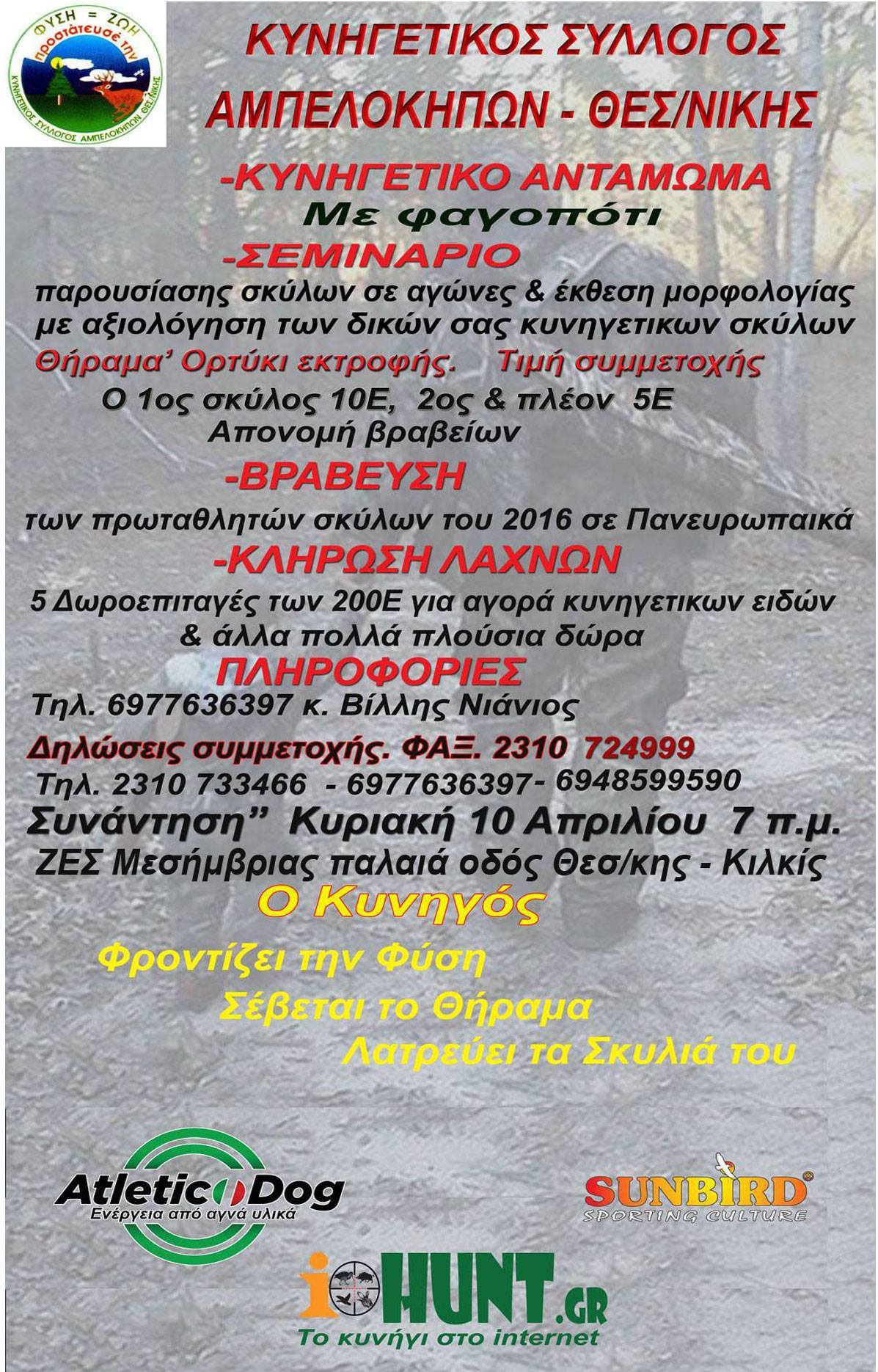 Την Κυριακή 10 Απριλίου ο Κυνηγετικός Σύλλογος Αμπελοκήπων διοργανώνει μεγάλη κυνοφιλική-κυνηγετική γιορτή με σεμινάριο-παρουσίαση σκύλων σε αγώνες με θήραμα ορτύκι και έκθεση μορφολογίας. Επίσης θα πραγματοποιηθεί: