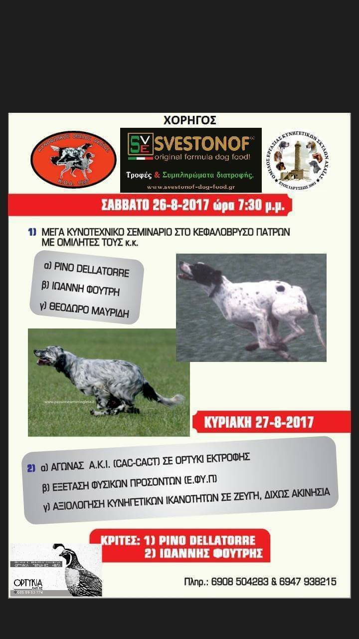 ΜΕΓΑ ΚΥΝΟΤΕΧΝΙΚΟ ΣΕΜΙΝΑΡΙΟ ΤΟ ΣΑΒΒΑΤΟ 26-8-2017 ΣΤΟ ΚΕΦΑΛΟΒΡΥΣΟ ΠΑΤΡΩΝ ΑΠΟ ΤΟΝ ΟΜΙΛΟ ΕΡΓΑΣΙΑΣ ΚΥΝΗΓΕΤΙΚΩΝ ΣΚΥΛΩΝ ΑΧΑΙΑΣ (Ο.Ε.Κ.Σ.Α) ΚΑΙ ΤΟΝ ΚΥΝΟΦΙΛΙΚΟ ΟΜΙΛΟ ΠΑΤΡΩΝ (Κ.Ο.Α).ΟΛΟΙ ΟΙ ΚΥΝΟΦΙΛΟΙ ΤΗΣ ΑΧΑΪΑΣ ΚΑΙ ΜΗ ΠΡΕΠΕΙ ΝΑ ΔΩΣΟΥΝ ΤΟ ΠΑΡΩΝ ΣΕ ΑΥΤΗ ΤΗΝ ΠΡΟΣΠΑΘΕΙΑ ΠΟΥ ΚΑΝΟΥΝ ΟΙ 2 ΟΜΙΛΟΙ ΓΙΑ ΤΗΝ ΑΝΑΔΕΙΞΗ ΤΗΣ ΚΥΝΟΦΙΛΙΑΣ.