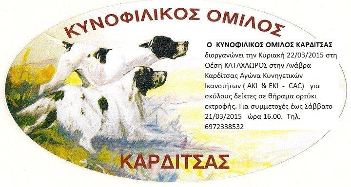 Ο Κυνοφιλικός Όμιλος Καρδίτσας διοργανώνει την Κυριακή 22 Μαρτίου 2015, στη θέση ΚΑΤΑΧΛΩΡΟΣ στην Ανάβρα Καρδίτσας Αγώνα Κυνηγετικών Ικανοτήτων (ΑΚΙ & ΕΚΙ – CAC) για σκύλους δείκτες σε θήραμα ορτύκι εκτροφής. Συμμετοχές θα γίνονται δεκτές μέχρι το Σάββατο 21 Μαρτίου και ώρα 16:00.