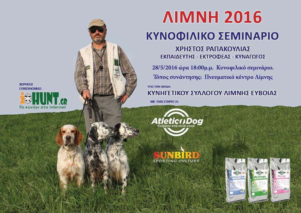 Κυνοφιλικό σεμινάριο διοργανώνει ο Κυνηγετικός Σύλλογος Λίμνης Ευβοίας την Κυριακή 28 Μαίου στις 6 το απόγευμα στο πνευματικό κέντρο Λίμνης. Ομιλητής θα είναι ο γνωστός εκτροφέας Χρήστος Ραπακούλιας. Μεγάλος χορηγός της εκδήλωσεις οι ιταλικές τροφές ATLETIC DOG.