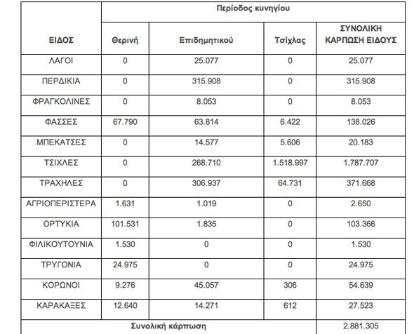 Η συνολική κάρπωση παρουσίασε αύξηση 19.6% και αυτό οφείλεται κυρίως στη σημαντική αύξηση της κάρπωσης της τσίχλας. Εδώ θα πρέπει επίσης να επισημανθεί ότι η πραγματική κάρπωση είναι μεγαλύτερη από αυτήν που παρουσιάζεται στην παρούσα έρευνα, αφού ένα ποσοστό θηραμάτων καρπώνεται από άτομα που κυνηγούν χωρίς να έχουν ανανεωμένη άδεια κυνηγίου, στοιχείο το οποίο δεν υπολογίζεται στην έρευνα.