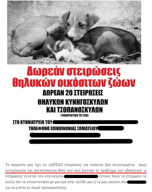 Σε πρόσφατη μάλιστα επικοινωνιακή σας δράση, η οποία δημοσιεύθηκε και στην ενημερωτική ιστοσελίδα με την επωνυμία «………………….» στις 17/04/2021, καλείτε τους νόμιμους ιδιοκτήτες θηλυκών δεσποζόμενων κυνηγόσκυλων, με την προϋπόθεση να είναι αυτά ηλεκτρονικά ταυτοποιημένα, να προβούν στην οικειοθελή στείρωσή τους που εσείς εξασφαλίσατε ως παροχή από τον κτηνίατρο κ. ……………………… στην ……………… (συνημμένη φωτό 2).