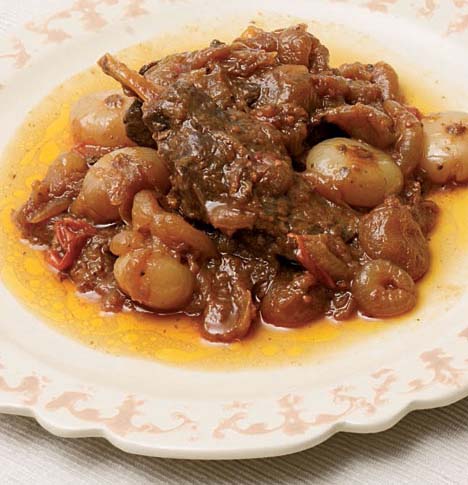 Συμπληρώνουμε όλα τα υλικά για το φαγητό (εκτός κρεμμυδιών) και λίγο ζεστό νερό. Σκεπάζουμε και βράζουμε σε χαμηλή θερμοκρασία έως ότου μαλακώσει το κρέας. Τότε προσθέτουμε και τα κρεμμύδια. Βράζουμε έως ότου μαλακώσουν (κρέας – κρεμμύδια) και δέσει η σάλτσα. Τότε ρίχνουμε το ξύδι και σβήνουμε τη φωτιά. Όποτε χρειάζεται συμπληρώνουμε ζεστό νερό. Να μείνει με τη σάλτσα του.