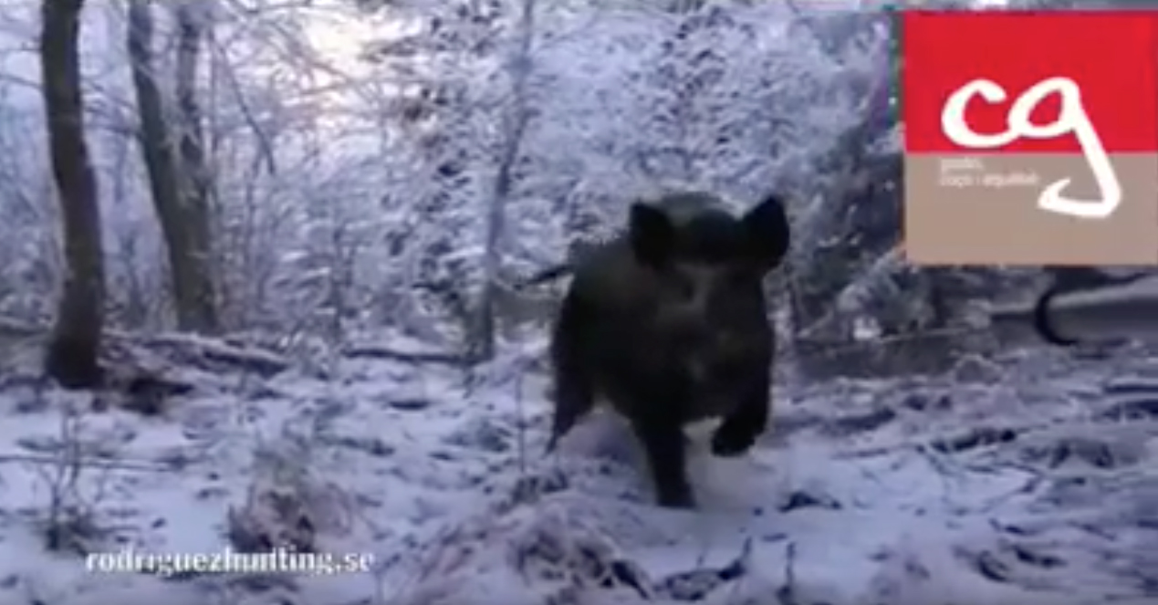 Εξαιρετικό πλάνο από ένα πολύ κοντινό τουφέκισμα αγριόχοιρου. Τα σκυλιά έχουν το γουρούνι σε στάμπα,ο κυνηγός περιμένει εκεί κοντά και το γουρούνι επιχειρεί έξοδο κυνηγώντας τα σκυλιά,όταν ξαφνικά αντιλαμβάνεται την παρουσία του κυνηγού….