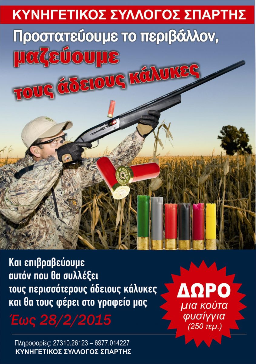 Άλλη μία δράση του Κυνηγετικού Συλλόγου Σπάρτης για το περιβάλλον! Έχοντας αποδείξει με τις συνεχόμενες δράσεις του ότι ο κυνηγός είναι ο καλύτερος προστάτης της φύσης, μιας και σε αυτή ζει, αναπνέει και κινείται, ο Κυνηγετικός Σύλλογος Σπάρτης ευαισθητοποιεί και παρακινεί τα μέλη του να συλλέξουν τους άδειους κάλυκες! Μάλιστα, επιβραβεύει με μία κούτα 250 φυσιγγίων αυτόν που θα συλλέξει τους περισσότερους άδειους κάλυκες και θα τους φέρει στα γραφεία του Συλλόγου (Χείλωνος 10), έως τις 28 Φεβρουαρίου 2015.