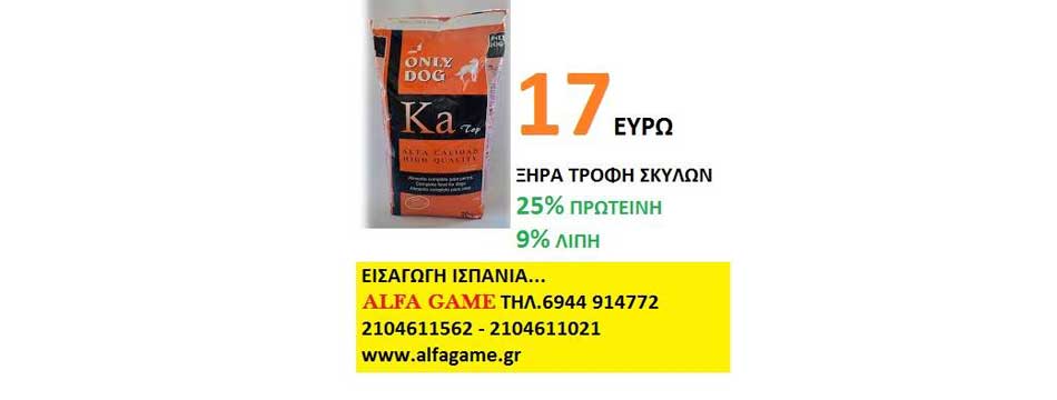 Τώρα που τελείωσε το κυνήγι δεν πρέπει να παραμελήσουμε τον σκύλο μας και πρέπει να προσέξουμε τη διατροφή του. Η εταιρεία ALFA GAME κάνει μια μεγάλη προσφορά σρτους Έλληνες κυνηγούς προσφέροντας μια ποιοτική ξηρά τροφή από την Ισπανία μόνο με 17 ΕΥΡΩ. Η τροφή περιέχει 25% πρωτείνη και 9% λίπη. Για περισσότερες πληροφορίες καλέστε στα τηλέφωνα : 210-4611562 , 210-4611021 , 6944 914772 ή στο www.alfagame.gr.
