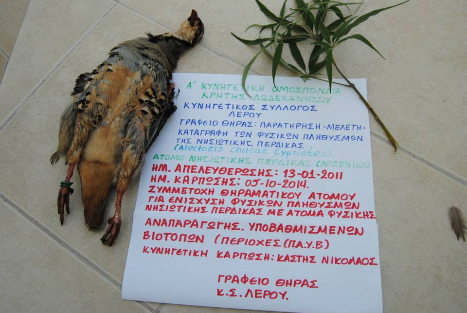 Στην εικόνα απεικονίζεται άτομο νησιώτικης πέρδικας,προερχόμενο από θηραματική κυνηγετική κάρπωση.