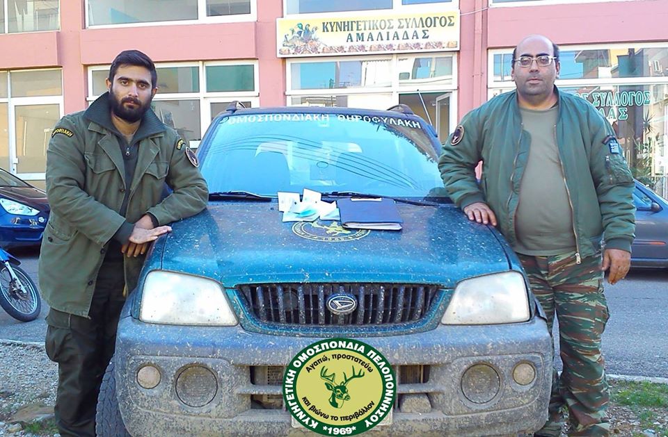 Την Τρίτη 8 Δεκεμβρίου 2015 ο Ομοσπονδιακός Θηροφύλακας Βασιλόπουλος Παναγιώτης με περιοχή ευθύνης του Κυνηγετικού Συλλόγου Αμαλιάδας σε συνεργασία με τον Θηροφύλακα του Κυνηγετικού Συλλόγου Αμαλιάδας Θεοδωρακόπουλο Θεόδωρο (αριστερά στην φωτό) αξιοποιώντας σχετικές καταγγελίες εντόπισαν δύο άτομα να ασκούν θήρα μπεκάτσας στο καρτέρι στην περιοχή Αγίου Δημητρίου Δήμου Ήλιδας.
