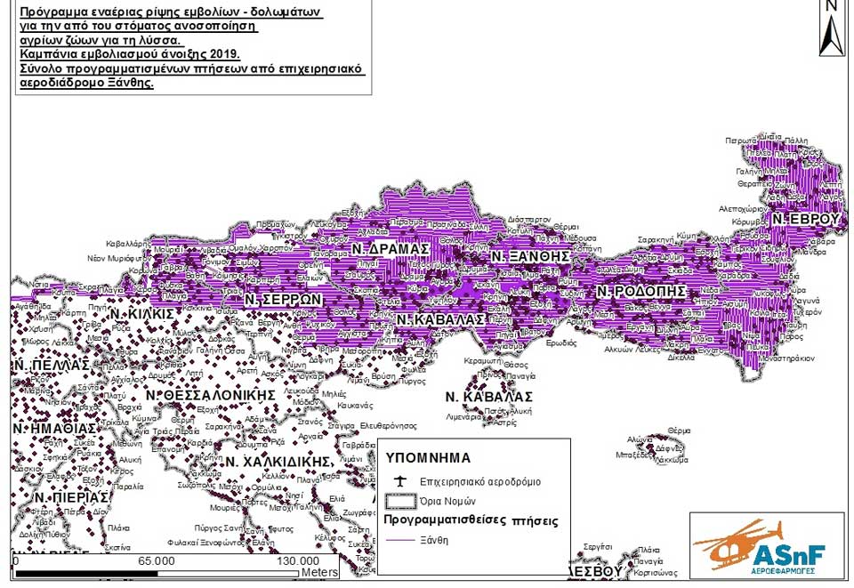 Σας ενημερώνουμε ότι στα πλαίσια της υλοποίησης του προγράμματος της ‘εναέριας ρίψης – διανομής εμβολίων-δολωμάτων κατά της λύσσας, για την από του στόματος ανοσοποίηση των άγριων ζώων’ στις 03/04/2019 έως και 13/04/2019, θα πραγματοποιηθούν ρίψεις εμβολίων – δολωμάτων από το αεροδρόμιο της Ξάνθης στις κάτωθι περιοχές :
