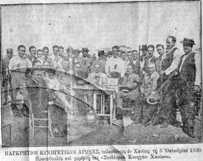 Ο «Σύνδεσμος Κυνηγών Χανιών» στις 5 Οκτωβρίου 1930 διοργάνωσε έναν πρωτότυπο διαγωνισμό, τους κυνηγετικούς αγώνες. Η ιστορική φωτογραφία και η λεζάντα της στο πρωτοσέλιδο της εφημερίδας «Κήρυξ» (5/10/1930) δίνουν σημαντικές πληροφορίες. Μια μεγάλη ομάδα ανδρών στέκεται όρθια σε ημικυκλική διάταξη πάνω από οκτώ καθισμένους άνδρες και ένα μικρό αγόρι, το οποίο κάθεται στα γόνατα ενός ενήλικα. Η αμφίεση των παρισταμένων είναι ευρωπαϊκή και αρκετοί από αυτούς είτε φορούν είτε κρατούν ψάθινα καπέλα. Επίσης, ορισμένοι από τους κυνηγούς κρατούν τις καραμπίνες τους. Ο δημοσιογράφος για να αναγνωρίσει ο αναγνώστης τα απεικονιζόμενα πρόσωπα έχει αριθμήσει κάποιους από τους φωτογραφισμένους άνδρες. Ποιοί είναι, όμως, όλοι αυτοί οι κυνηγοί;