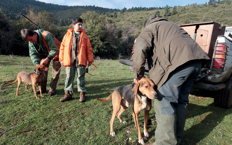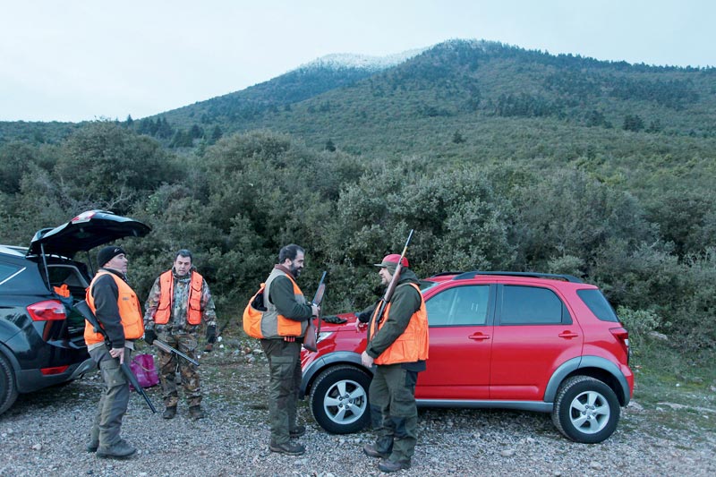 Οι άπειροι ντόπιοι «παγανιέρηδες» του τότε, που από τον λαγό το γύρισαν αίφνης στον αγριόχοιρο, τώρα πια δεν υπάρχουν… Τη θέση τους έχουν πάρει «παρέες» έμπειρες, με κυνηγούς δεξιοτέχνες στην ιχνηλασία, ποδάρια από σίδερο και σκυλιά που ξέρουν καλά το «παιχνίδι». Αχάραγα, στο γραφικό καφενείο δίπλα στη σόμπα με τα ποτηράκια του κονιάκ στα χέρια, γνωρίσαμε τα υπόλοιπα μέλη της παρέας, ντόπιους και Αθηναίους… Τα χνώτα τους έχουν ταιριάξει εδώ και καιρό, κάτι απαραίτητο για να έχει μια ομάδα επιτυχίες. Ο Χρήστος, ο Κώστας και ο Πέτρος έρχονται από την Αθήνα κάθε Σαββατοκύριακο, για να ενταχθούν στον σχεδιασμό της εξόρμησης.