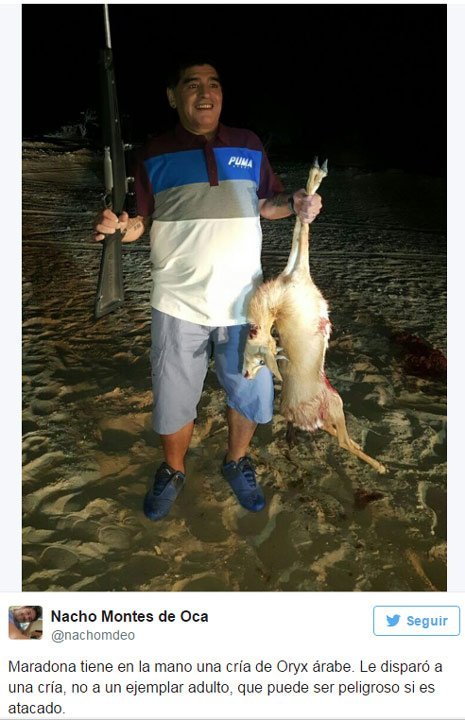 Ο δημοσιογράφος που ανέβασε τη φωτογραφία στο Twitter και κάνει το γύρο του Διαδικτύου έγραψε στη λεζάντα εξοργισμένος: «Ο Μαραντόνα έχει στο χέρι μία Arabian Oryx. Τη σκότωσε και δεν είναι υποδειγματική συμπεριφορά ενός ενηλίκου αυτή», αναφέρει χαρακτηριστικά στη δημοσίευσή του ο Nacho Montes de Oca.