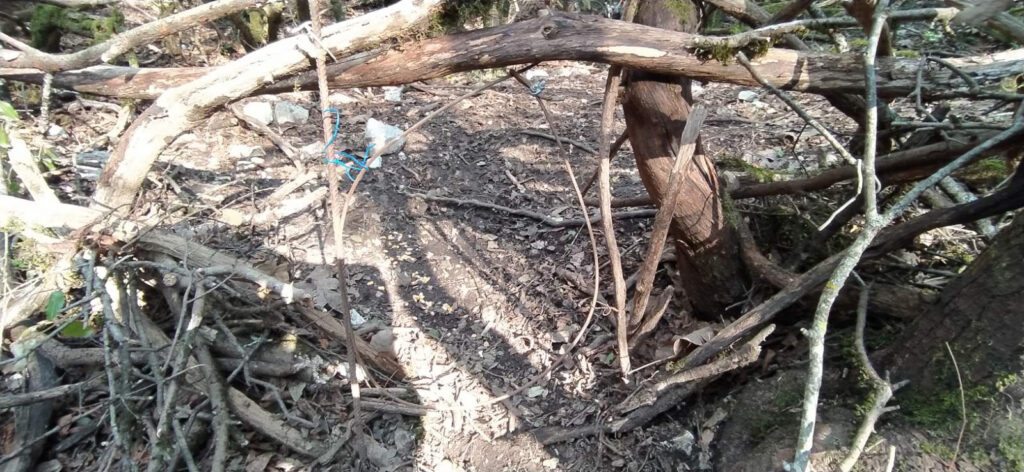 Κατά την περιπολία του κλιμακίου σε μικρή απόσταση από τον κεντρικό επαρχιακό οδικό άξονα, οι Θηροφύλακες εντόπισαν πέντε αυτοσχέδιες θηλιές παγίδευσης τριχωτών θηραμάτων, με συρματόσχοινο, ενώ στο σημείο, ο δράστης είχε ρίξει και καλαμπόκι για την προσέλκυση των θηραμάτων.