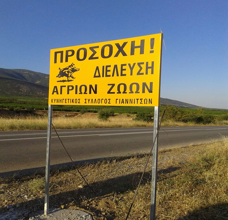 τοποθέτησε επί της παλαιάς Επαρχιακής Οδού Γιαννιτσών – Αριδαίας πινακίδες σήμανσης διέλευσης αγρίων ζώων μετά από δύο τροχαία ατυχήματα με πρόσκρουση ΙΧΕ με αγριόχοιρο, εντός του τελευταίου 15ημέρου.