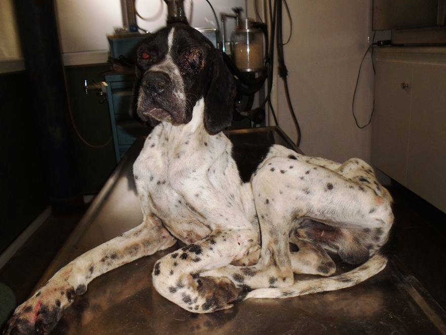 Το άτυχο πόιντερ βρέθηκε στις 21 Ιουνίου από την πρόεδρο του φιλοζωικού ομίλου Καρδίτσας στην πόλη της Καρδίτσας. Το πόιντερ ήταν σε τραγική κατάσταση όπως μπορείτε να δείτε και στις φωτογραφίες. Του λείπει το ένα μάτι και το άλλο χρειάζεται αφαίρεση γιατί πρησμένο και κατεστραμμένο και επιπλέον τα πόδια του ήταν γεμάτα άγανα.