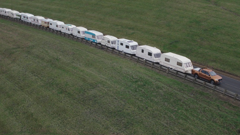 Το video γυρίστηκε στην πίστα «Millbrook Proving Ground» της Βρετανίας και το κομβόι έφθανε σε μήκος τα 100 μέτρα! Για τις ανάγκες των γυρισμάτων, τα τροχόσπιτα ενισχύθηκαν με ατσάλινα πλαίσια και εφοδιάστηκαν με κοτσαδόρους τόσο στο εμπρός όσο και στο πίσω μέρος. Το Ranger έφερε τον δίλιτρο EcoBlue Bi-turbo κινητήρα diesel απόδοσης 213 ίππων και 500 Nm ροπής, ο οποίος συνδυάζεται με αυτόματο κιβώτιο 10 σχέσεων.