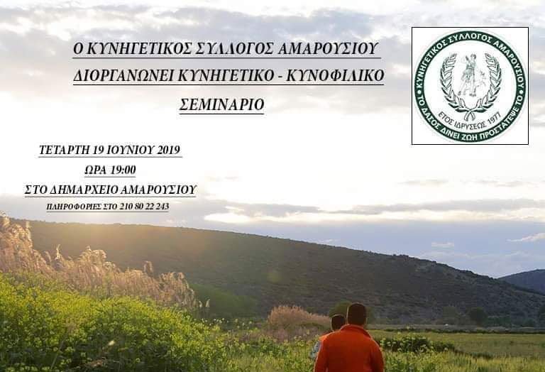 Ο Κυνηγετικός Σύλλογος Αμαρουσίου θα πραγματοποιήσει την Τετάρτη 19 Ιουνίου 2019 και ώρα 19:00 στο Δημαρχείο Αμαρουσίου Κυνηγετικό-Κυνοφιλικό σεμινάριο. Tα θέματα που θα συζητήθούν είναι :
