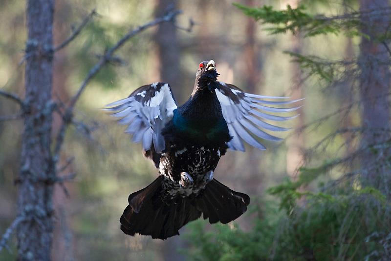 Με το ερχομό της αυγής το πουλί πάνω σε ένα παχύ κλαρί σε κάποιο δέντρο του δάσους αρχίζει να παρατηρεί την γύρω περιοχή και να βγάζει την γνωστή του κραυγή.Αυτός είναι ένα βαρύς ήχος σαν ποδοβολητό μεγάλου αλόγου και προκαλείται σε συνδυασμό από κίνηση των φτερών , χτύπημα ποδιών και από κάποιες ειδικές σακούλες που έχει στο λαιμό του .Αυτός ο έντονος θόρυβος είναι χαρακτηριστικός και γίνεται αιτία πολλές φορές της αποκαλύψεως του και του θανάτου του . Ειδικά δε αυτήν την εποχή είναι τρομερά απρόσεκτος μίας και είναι αφοσιωμένος στο φλερτάρισμα. Αυτό γίνεται στην αρχή , έτσι οριοθετεί τον χώρο του και δηλώνει την παρουσία του , όταν τελικά φτάνει κάποιο η κάποια θηλυκά κατεβαίνει από το δέντρο σε ένα άνοιγμα ανάμεσα στα δέντρα και συνεχίζει την παράσταση του ακόμη πιο εντυπωσιακά.