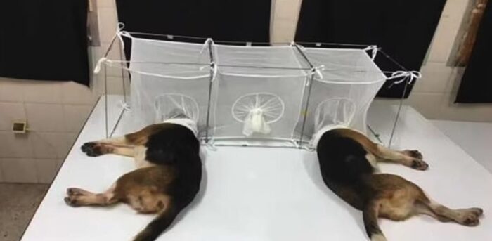 Τα θλιβερά στιγμιότυπα δείχνουν κουτάβια να έχουν τα κεφάλια τους μέσα σε κλουβιά τύπου μουσελίνας, γεμάτα με πεινασμένα έντομα. Το πείραμα χρηματοδοτήθηκε από τα Εθνικά Ινστιτούτα Αλλεργιών και Λοιμωδών Ασθενειών με 375.000 δολάρια, τα οποία δόθηκαν σε τυνησιακό ερευνητικό εργαστήριο.