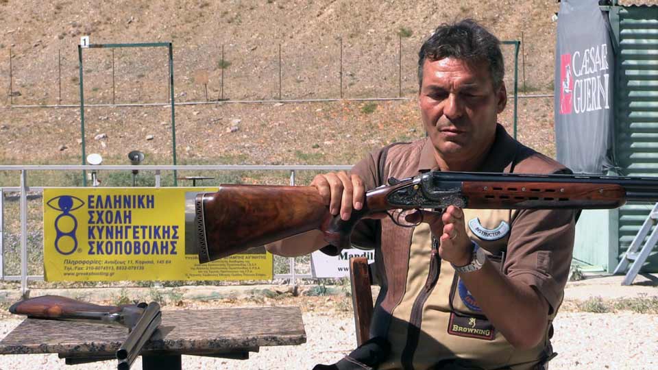 Ο διευθυντής της Ελληνικής Σχολής Κυνηγετικής Σκοποβολής , Μπάμπης Αιγινήτης προσπαθεί να εξηγήσει τι σημαίνει καλοζυγισμένο κυνηγετικό όπλο.