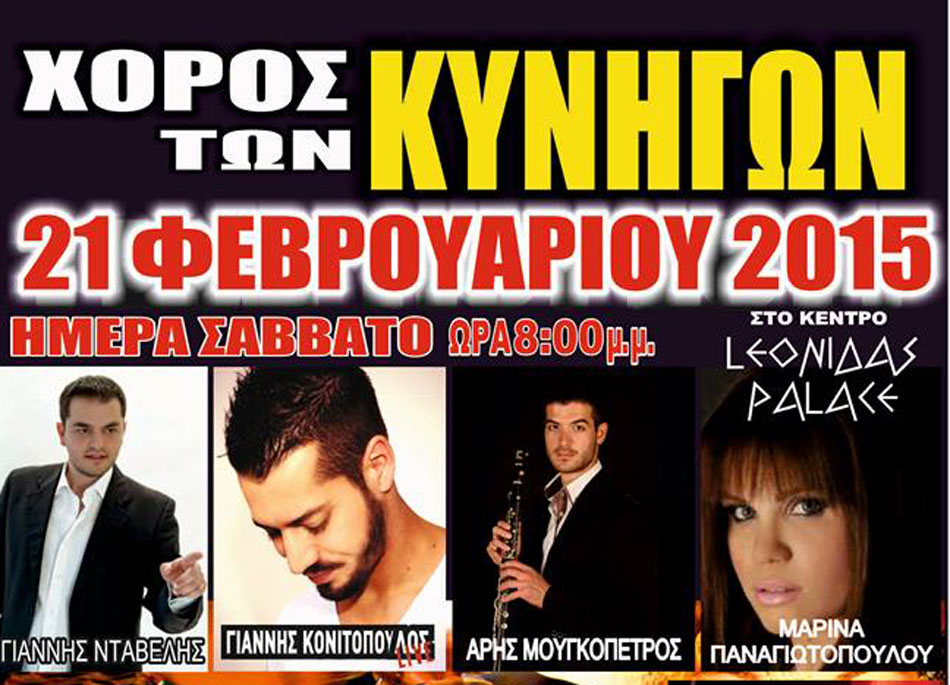 Ο Κυνηγετικός Σύλλογος Σπάρτης, μετά την απόλυτα επιτυχημένη δεξίωση του 2014, τον οποία τίμησαν μαζικά με την παρουσία τους 1200 άτομα, προσκαλεί και φέτος τα μέλη και τους φίλους του, στο χορό των Κυνηγών 2015, στο Leonidas Palace! Το κοσμικό γεγονός της Λακωνίας θα λάβει χώρα το Σάββατο 21 Φεβρουαρίου, στις 08.00 μ.μ.