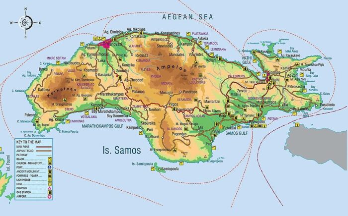Συνεχίζουμε αυτόν αριστερά και φτάνουμε τον δρόμο που οδηγεί στη χωματερή, συνεχίζοντας δεξιά είμαστε στην εθνική οδό Σάμου -Καρλοβάσου (αρχικό σημείο).