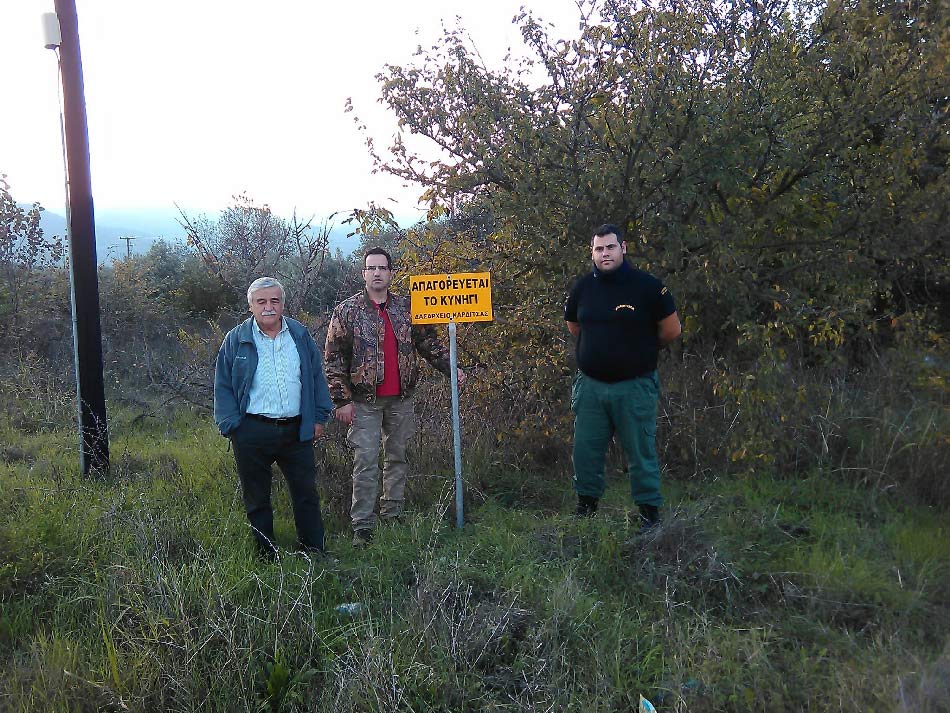 Συγκεκριμένα την Τρίτη 27-10 2015 συνεργείο του Συλλόγου αποτελούμενο από τον Ομοσπονδιακό Θηροφύλακα Κότσιαλο Χρήστο, τον κ. Βλαχούτσο Νικόλαο, τον Δασοπόνο Κρανίτσα Βασίλειο και τον σημερινό Πρόεδρο ως επικεφαλή, τοποθέτησε στα όρια της απαγόρευσης τις κατάλληλες πινακίδες σήμανσης “ΑΠΑΓΟΡΕΥΕΤΑΙ ΤΟ ΚΥΝΗΓΙ” σηματοδοτώντας έτσι με σαφή τρόπο τα όρια μιας απαγόρευσης που περιλαμβάνει πλέον και την τεχνητή αναρρυθμιστική λίμνη και τις εγκαταστάσεις του παλιού εργοταξίου ΔΕΗ καθώς και αρκετά από τα σπίτια και τις επιχειρήσεις που δραστηριοποιούνται μέσα στην εν λόγω περιοχή.