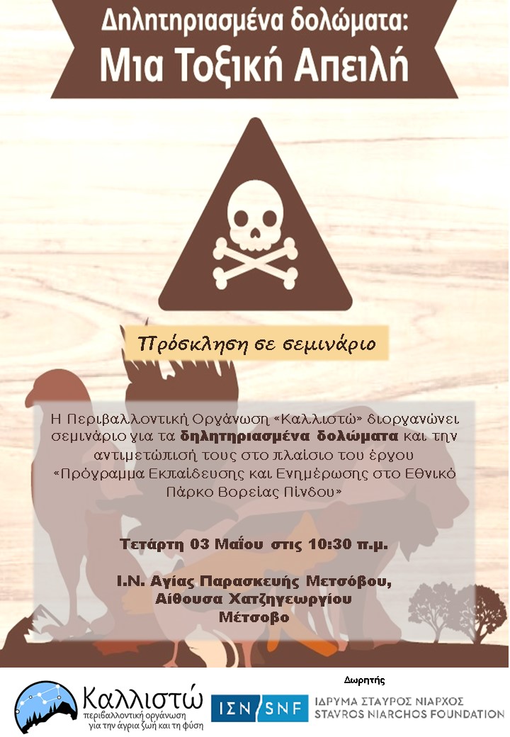 Στο πλαίσιο του προγράμματος Εκπαίδευσης και Ενημέρωσης στο Εθνικό Πάρκο Βόρειας Πίνδου , το οποίο υλοποιείται με χορηγία του Ιδρύματος Σαύρος Νιάρχος, η Περιβαλλοντική Οργάνωση Καλλιστώ διοργανώνει σεμινάρια σχετικά με την αντιμετώπιση του περιβαλλοντικού και κοινωνικού προβλήματος των δηλητηριασμένων δολωμάτων (φόλες). Την Τετάρτη 3 Μαΐου 2017, στις 10:30 πμ θα πραγματοποιηθεί σεμινάριο στην αίθουσα Χατζηγεωργίου του Ι.Ν. Αγίας Παρασκευής .
