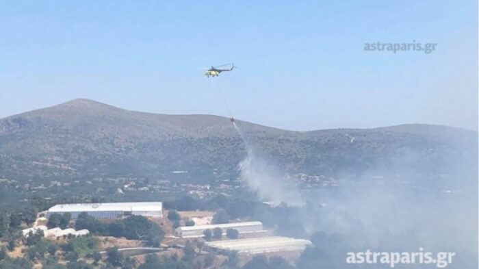Επιχειρούν τέσσερα ελικόπτερα και δύο αεροσκάφη της Πυροσβεστικής – Πνέουν ισχυροί άνεμοι στην περιοχή