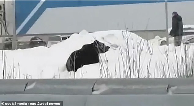 Μία αρκούδα κυνηγάει έναν πεζό δίπλα σε μία πολυσύχναστη λεωφόρο του Νιζνεβατόβσκ στη Σιβηρία.