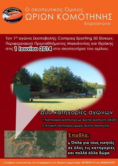 Tον πρώτο επίσημο αγώνα σκοποβολής CompaqSporting 50 δίσκων, με τη συμμετοχή διακεκριμένων σκοπευτών απ’ όλη την Ελλάδα, διοργανώνει ο πάντα πρωτοπόρος σκοπευτικός όμιλος ΩΡΙΩΝ Κομοτηνής.