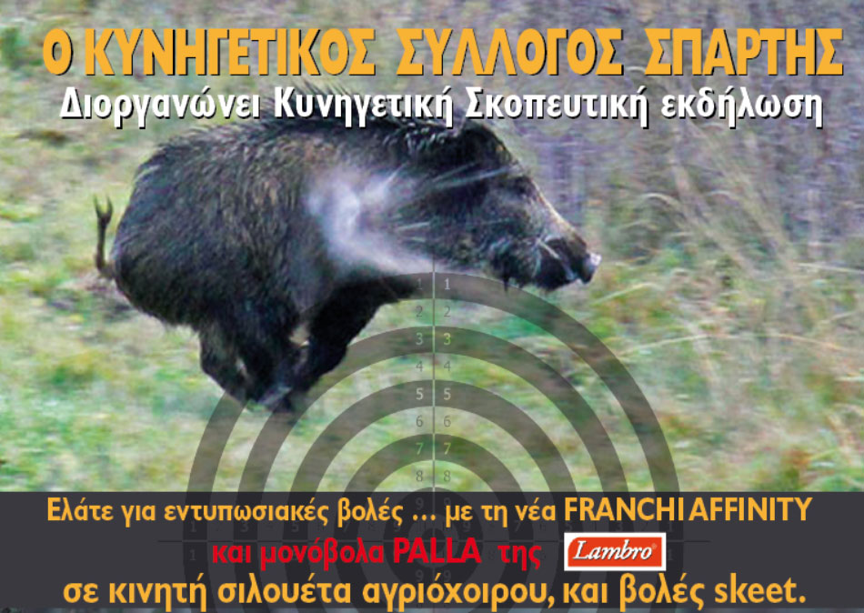 Στις 22 Ιουλίου η εταιρεία Σ. ΝΑΥΠΛΙΩΤΗΣ ΑΒΒΕ σε συνεργασία με τον ΚΥΝΗΓΕΤΙΚΟ ΣΥΛΛΟΓΟ ΣΠΑΡΤΗΣ και τον ΣΚΟΠΕΥΤΙΚΟ ΟΜΙΛΟ ΣΠΑΡΤΗΣ διοργανώνει σκοπευτική-κυνηγετική εκδήλωση σε κινητή σιλουέτα αγριόχοιρου και βολές skeet.