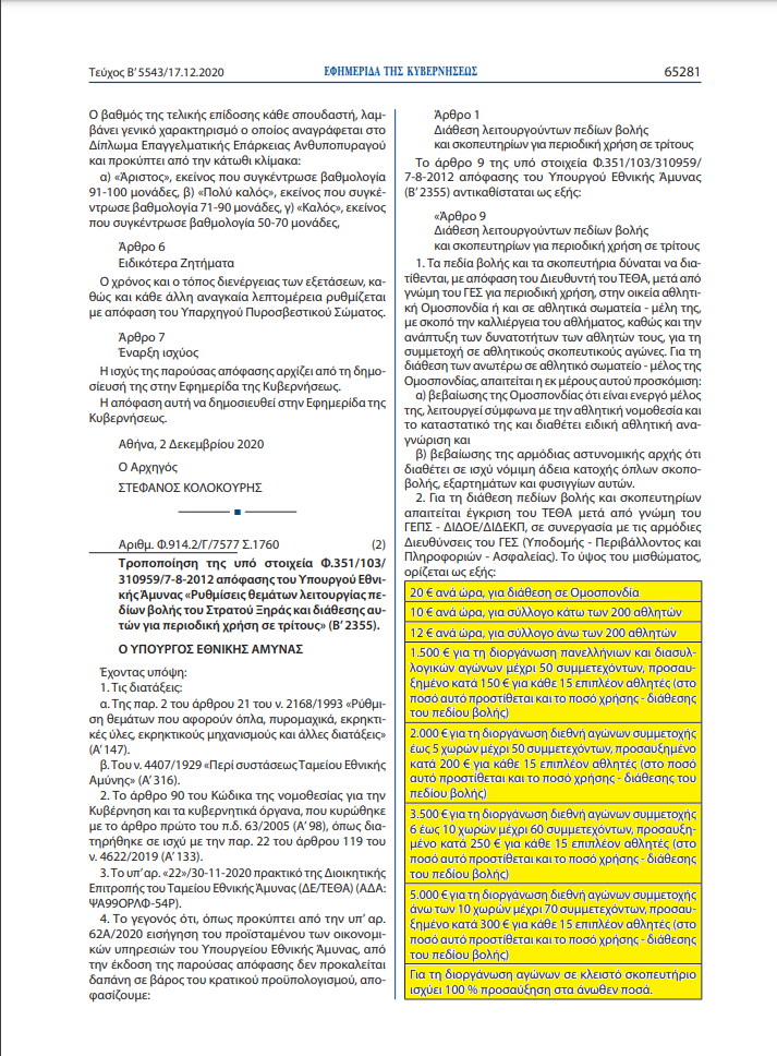 Η σχετική απόφαση που δημοσιεύθηκε στο ΦΕΚ 5543/17/12/2020 (εδώ) , τροποποιεί την Φ.351/103/310959/7-8-2012 (εδώ) απόφαση του Υπουργού Εθνικής Άμυνας «Ρυθμίσεις θεμάτων λειτουργίας πεδίων βολής του Στρατού Ξηράς και διάθεσης αυτών για περιοδική χρήση σε τρίτους» και περιλαμβάνει αποζημιώσεις αγώνων και ωριαία ενοίκια για τη χρήση των πεδίων βολής, σε πλαίσιο 12ημέρου, ποσά τα οποία δεν μπορούν να καταβληθούν.