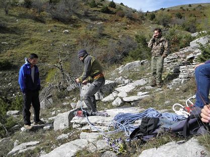 Βρέθηκε επί τόπου με τον εξοπλισμό του κι ύστερα από μία καλά οργανωμένη επιχείρηση κατέβηκα στο βάραθρο και σε βάθος είκοσι περίπου μέτρων, όπου ήταν εγκλωβισμένα τα δύο σκυλιά.