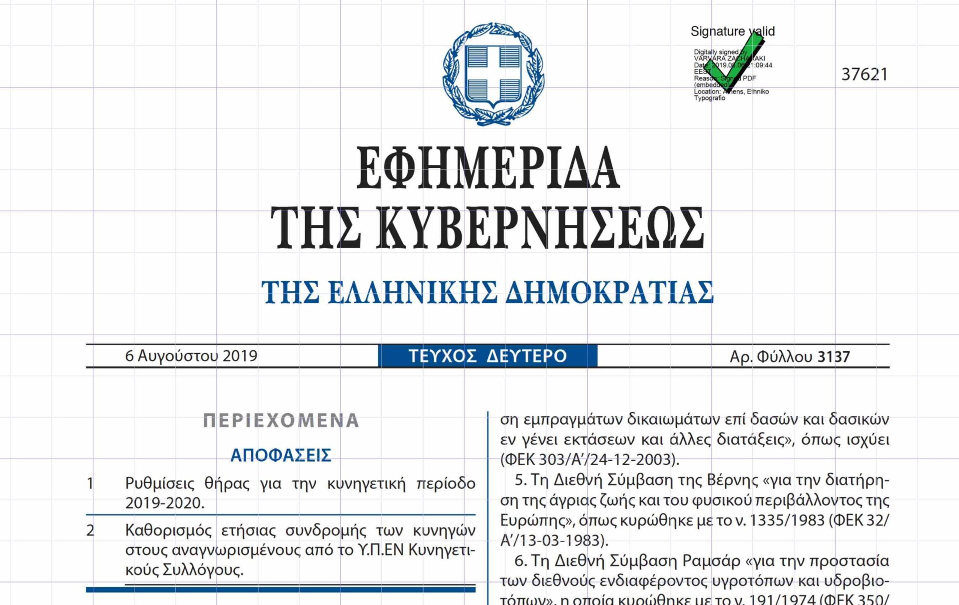 Δημοσίσυτηκαν στην εφημερίδα της κυβέρνησης οι αποφάσεις του αρμόδιου υπουργού για το κυνήγι κ. Χατζηδάκη για τις ρυθμίσεις θήρας 2019-2020 και για τέλη και τις συνδρομές των κυνηγετικών οιργανώσεων.