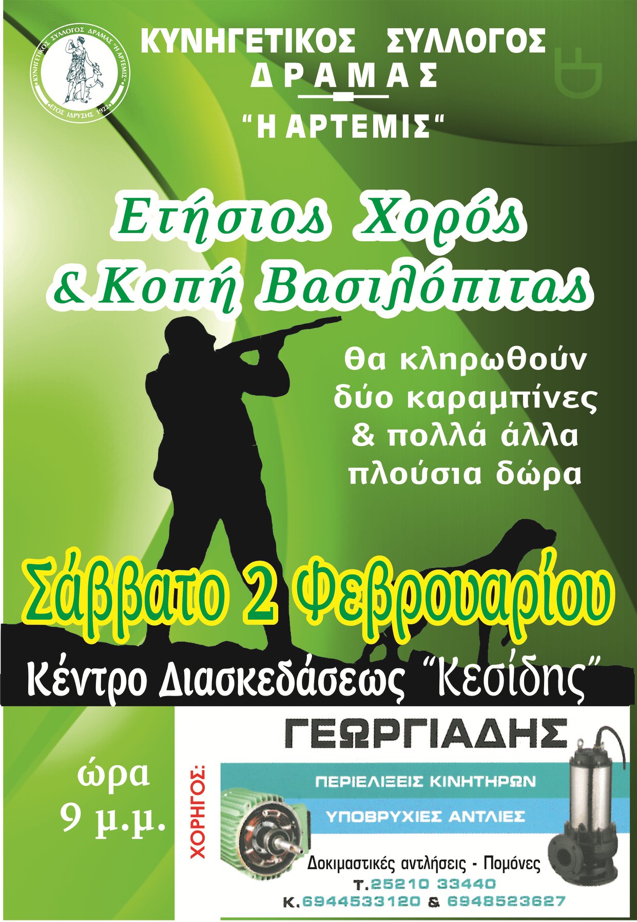 Ο ετήσιος χορός και η κοπή της πρωτοχρονιάτικης πίτας του Κυνηγετικού Συλλόγου Δράμας θα πραγματοποιηθεί το Σάββατο 2 Φεβρουαρίου 2019 στο κέντρο διασκέδασης “ΚΕΣΙΔΗΣ”. Θα υπάρχει πλούσιο λαϊκό και ποντιακό πρόγραμμα και θα κληρωθούν 2 καραμπίνες και πολλά δώρα.