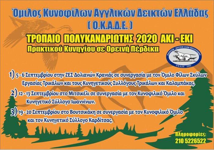 Το Σάββατο 5 Σεπτεμβρίου είναι ο πρώτος αγώνα για το “ΤΡΟΠΑΙΟ ΠΟΛΥΚΑΝΔΡΙΩΤΗΣ 2020” που διοργανώνει ο Ο.Κ.Α.ΔΕ. Οι αγώνες για το ΤΡΟΠΑΙΟ ΠΟΛΥΚΑΝΔΡΙΩΤΗΣ είναι αγώνες για πόιντερ και σέττερ σε άγρια ορεινή πέρδικα.