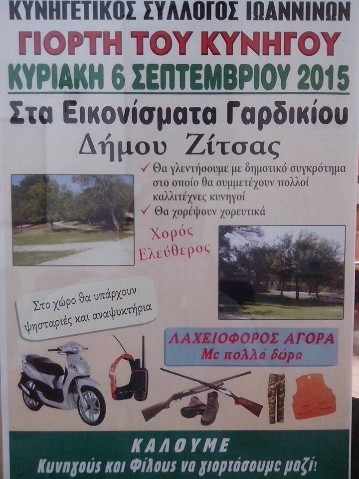 Την Κυριακή 6 Σεπτεμβρίου 2015 ο Κυνηγετικός Σύλλογος Ιωαννίνων διοργανώνει την γιορτή κυνηγού στα Εικονίσματα Γαρδικίου Δήμου Ζίτσας.