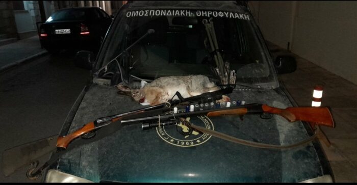 Ειδικότερα, λίγο μετά τις 11.30 το βράδυ της Παρασκευής κατά τον έλεγχο που έγινε στο αυτοκίνητο των δύο ατόμων βρέθηκε ένας σκοτωμένος λαγός, δύο κυνηγετικά όπλα τα οποία έφεραν προσαρμοσμένο φωτισμό στις κάννες τους και ήταν γεμάτα με φυσίγγια έτοιμα προς χρήση, καθώς και 21 φυσίγγια.
