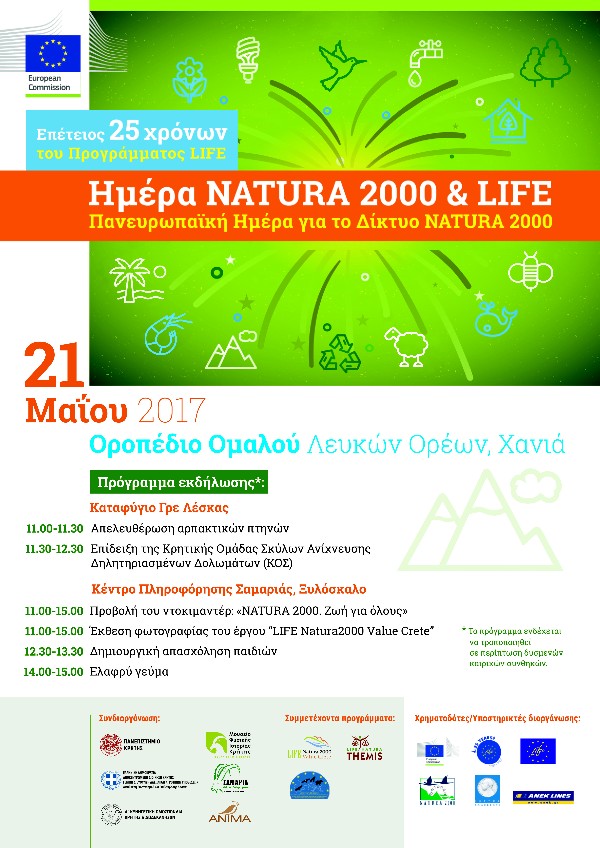 Η Α΄ Κυνηγετική Ομοσπονδία Κρήτης Δωδεκανήσου θα συμμετέχει, την Κυριακή, 21 Μαΐου 2017, στην εκδήλωση που διοργανώνει το Πανεπιστήμιο Κρήτης-Μουσείο Φυσικής Ιστορίας Κρήτης (ΠΚ-ΜΦΙΚ), στο Καταφύγιο της Γρε Λέσκας και στο Κέντρο Πληροφόρησης Σαμαριάς, στο Ξυλόσκαλο (Ομαλό Λευκών Ορέων) για την Πανευρωπαϊκή Ημέρα για το Δίκτυο NATURA 2000 καθώς και την επέτειο συμπλήρωσης 25 χρόνων από την έναρξη του Προγράμματος LIFE.