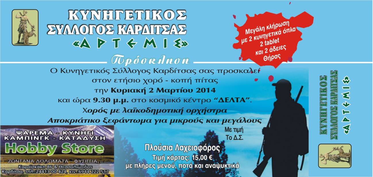 Ο Κυνηγετικός Σύλλογος Καρδίτσας σας προσκαλεί στον ετήσιο χορο-κοπή πίτας της Κυριακή 2 Μαρτίου 2014 και ώρα 9.30 μ.μ. στο κοσμικό κέντρο “ΔΕΛΤΑ”. Χορός με λαϊκοδημοτική ορχήστρα και αποκριάτικο ξεφάντωμα για μικρούς και μεγάλους.